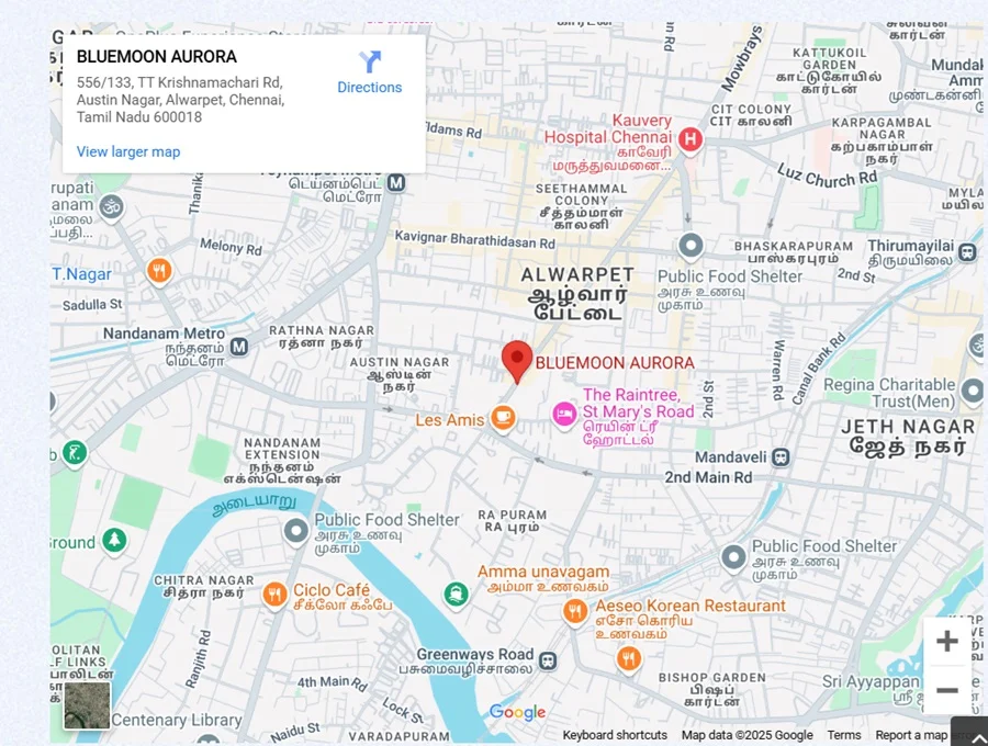 Bluemoon Aurora Residential project in Chennai offering Villa for Sale in Alwarpet. The property offers 4BHK Villa meticulously planned that guarantee a hassle-free lifestyle. As per the area plan it has 5 units in the size range 3575 sq.ft. Possession date is Dec 2025. Bluemoon Aurora offers prices suitable for both luxurious and affordable Villa in Chennai. Bluemoon Aurora is located Alwarpet. This is considered as best Villa for Sale in Chennai and best Villa for Sale in Alwarpet.