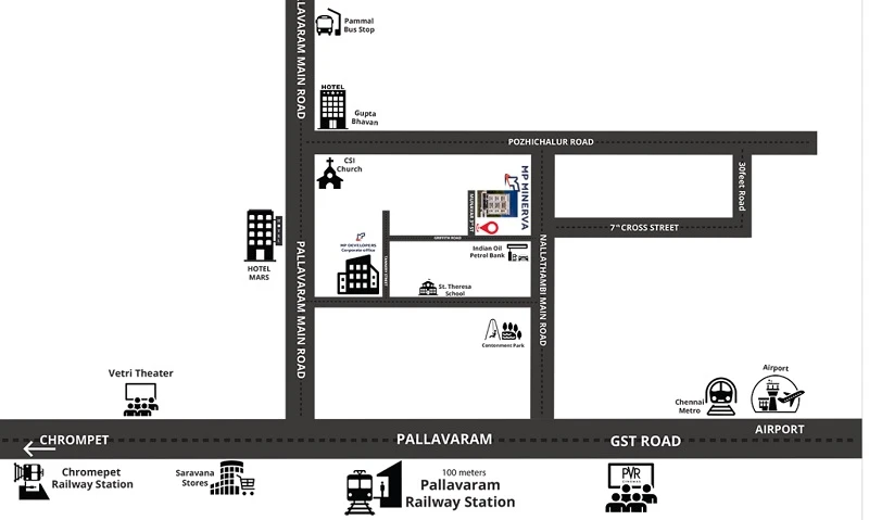 In terms of facilities, MP Minerva is loaded with multiple offerings such as Gymnasium, Power Backup. For families with kids, there is Children Play Area. It is a Gated Community. Immerse yourself in a world of sports with provisions for Tennis Court, Basketball court, Badminton Court, Cycling. Residents can make use of Restaurants/Cafeterias, Internet / Wi-Fi, provisions in the project. There is 24x7 Security. It is one of the most admired properties for Sale in Chennai and admired properties for Sale in Pallavaram.